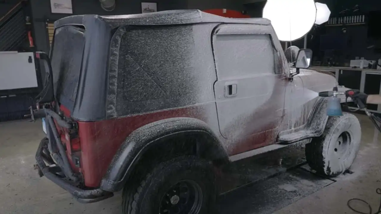 El primer paso antes de llevar el Jeep hasta el taller es darle un baño. Al igual que en otros muchos casos de los que ya hemos hablado, el moho y la suciedad desaparecen inmediatamente, dejando el Jeep limpio... pero cubierto de una neblina opaca.