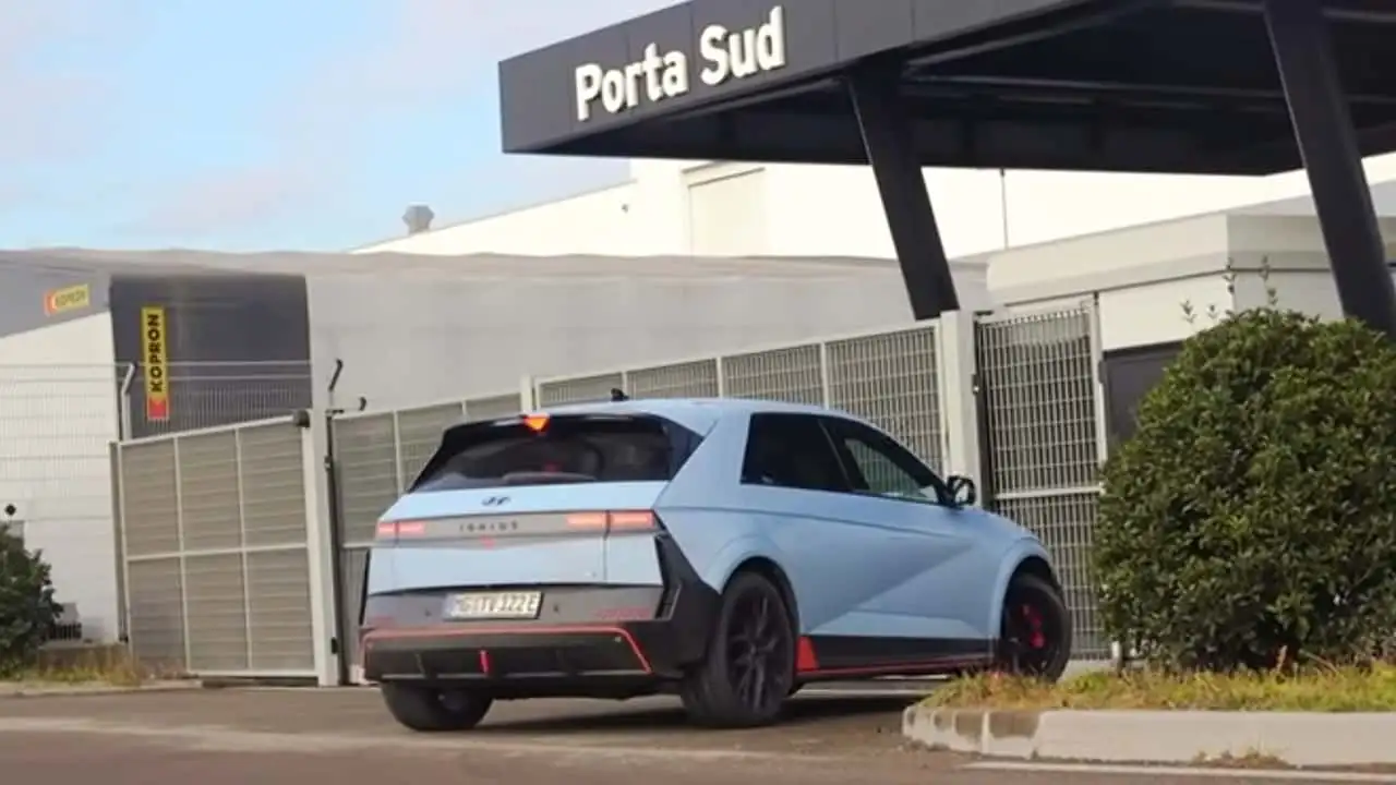 Hemos visto este tipo de desfile de Lamborghini desde este lugar muchas veces, ocasionalmente acompañados por modelos de Ferrari u otros competidores. Así que fue un 'shock' ver un IONIQ 5 N salir de la puerta y pasar silenciosamente por delante de la cámara. Y no fue algo puntual: el mismo ejemplar de Hyundai Performance volvió a la entrada más tarde en el vídeo.