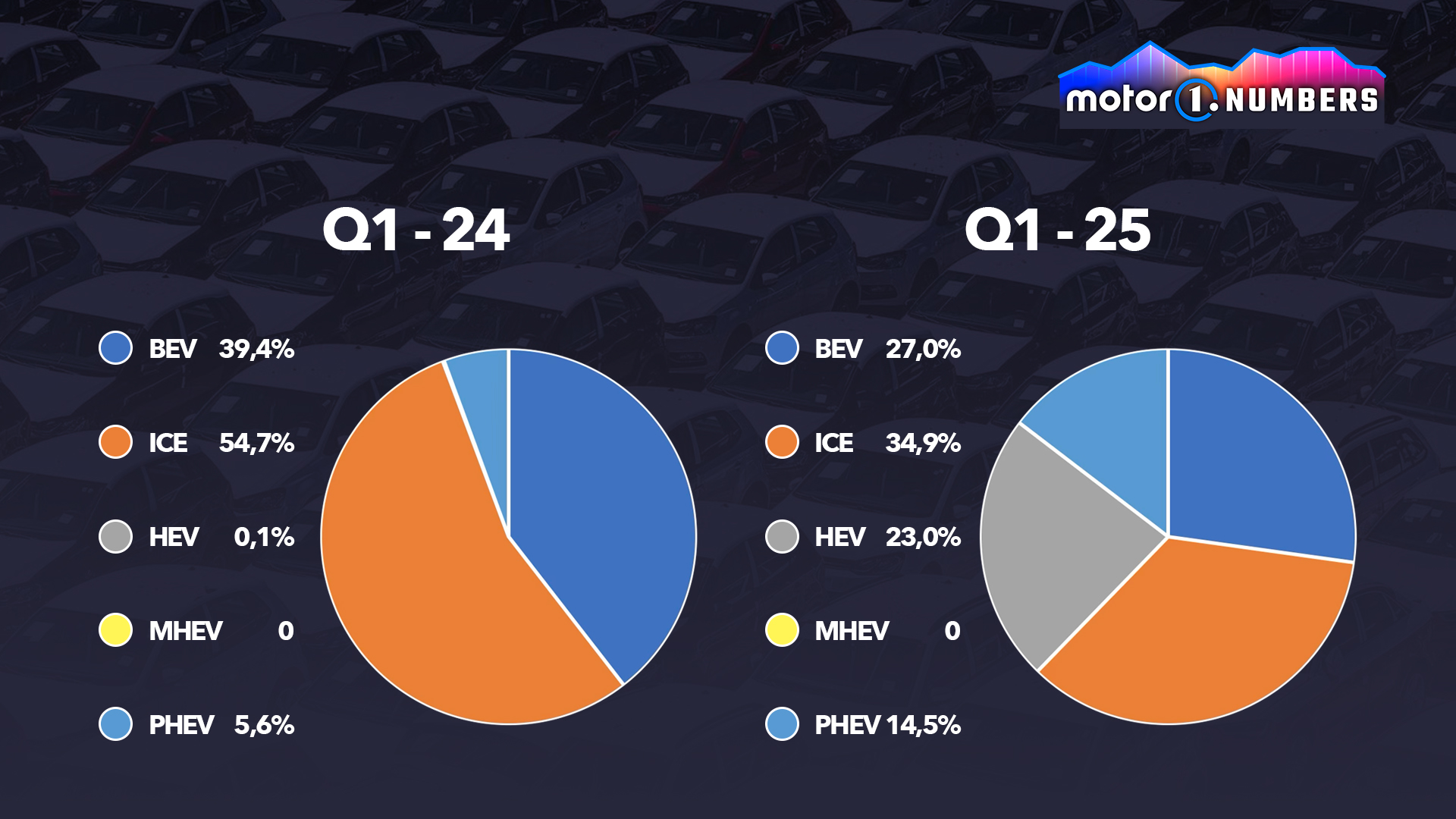 Un año después, en el periodo enero-marzo de 2025, los coches eléctricos y de combustión representaron el 27% y el 35% del total, respectivamente. En comparación, los híbridos alcanzaron el 23% de los volúmenes y los híbridos enchufables, el 15%.